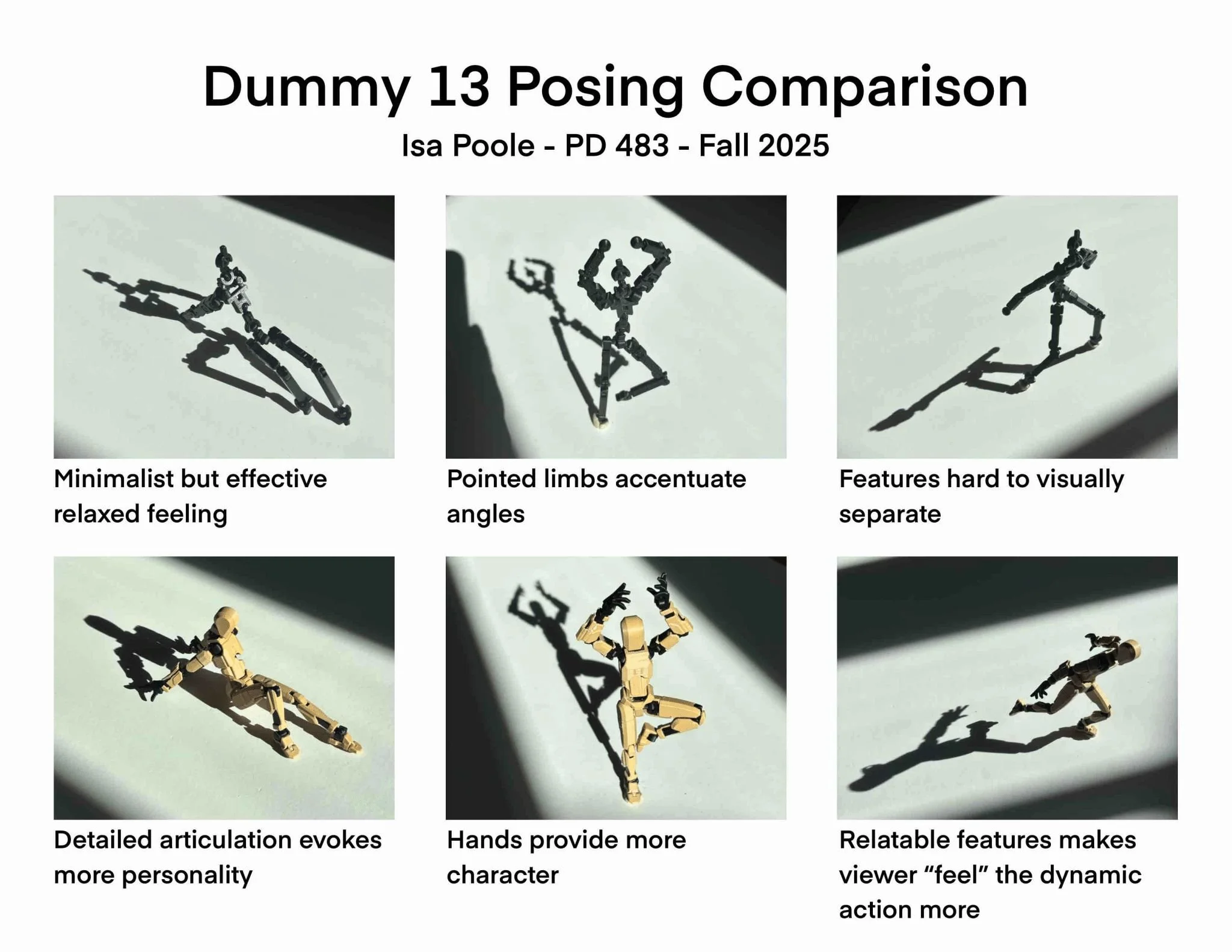 I started by working backwards, reverse engineering an existing 3D printed dummy figure to see what the different joint styles looked like and how they worked. From there, it was all about developing my characters, their relationships with one another, and figuring out how to integrate the joints seamlessly within their look.